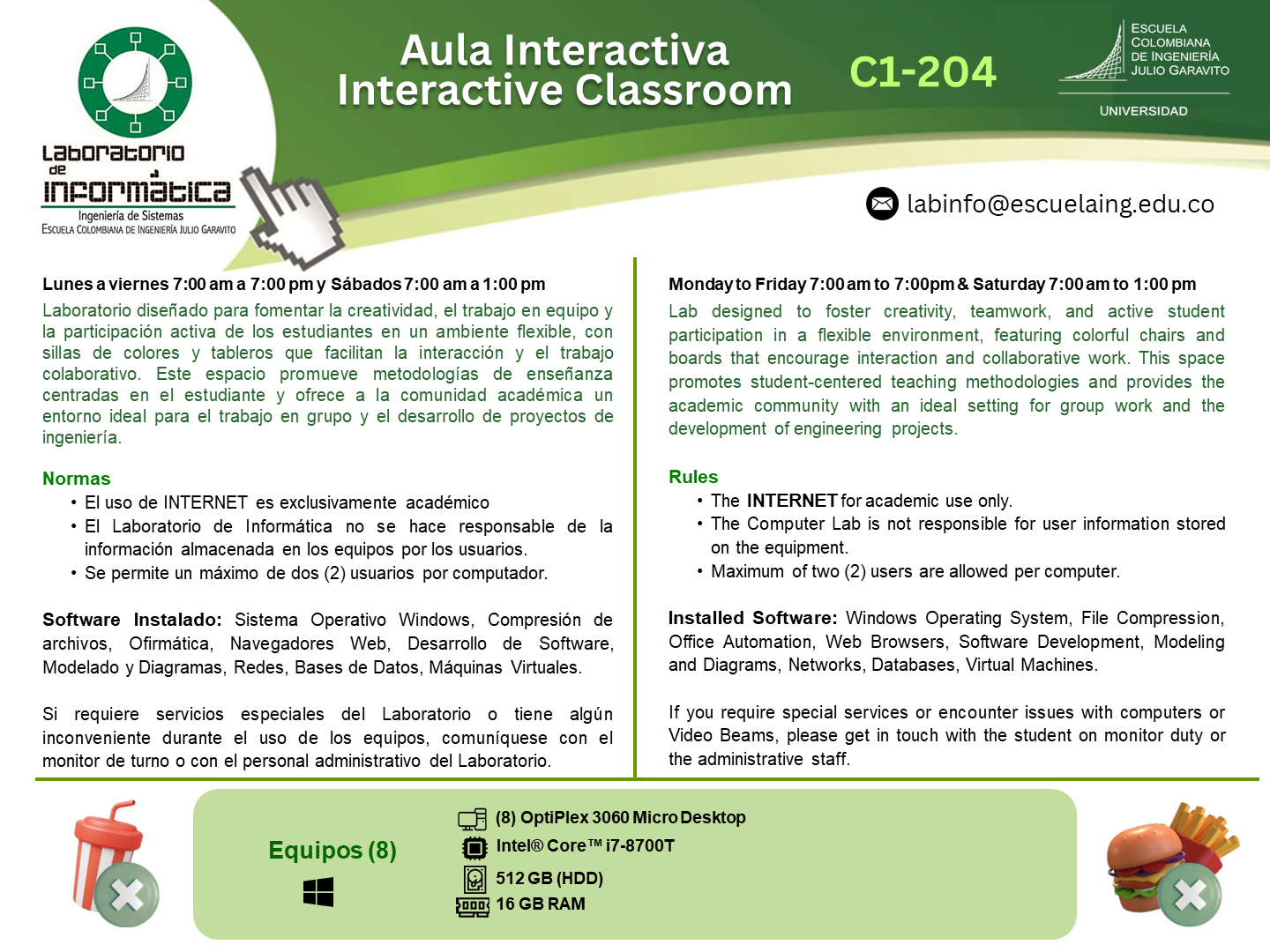 Esta aula busca favorecer la aplicación de nuevas metodologías de enseñanza/aprendizaje centradas en el estudiante. Además, ofrece a estudiantes y profesores del Programa un espacio especializado para trabajos en grupo y para desarrollo de proyectos de ingeniería.
