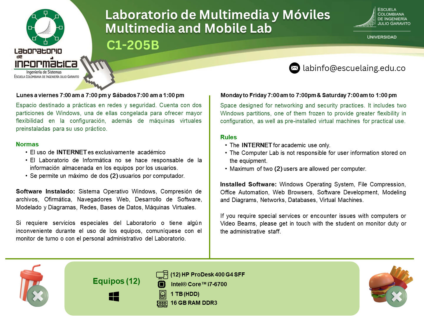 Ofrecer a estudiantes y profesores del Programa un espacio especializado para trabajo en el área de aplicaciones móviles, interacción humano-computador y desarrollos multimedia. Cuenta con ambiente Windows y permite la creación de máquinas virtuales personalizadas para dar mayor flexibilidad a los montajes requeridos.