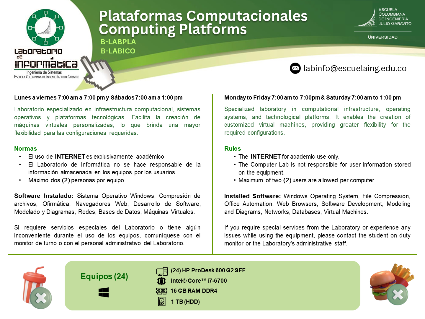 Ofrecer a estudiantes y profesores del Programa un espacio especializado para trabajo en el área de infraestructura computacional, sistemas operativos y plataformas computaciones que doble arranque Linux/Windows y permite la creación de máquinas virtuales personalizadas para dar mayor flexibilidad a los montajes requeridos Hace parte del Laboratorio de Infraestructura computacional junto con el laboratorio de Redes de Computadores, los cuales pueden integrarse para facilitar el trabajo en grupos grandes.