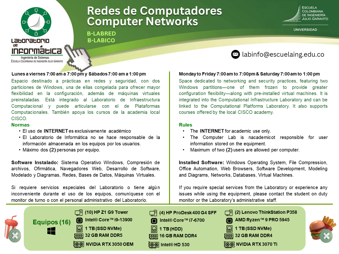 Ofrecer a estudiantes y profesores del Programa un espacio especializado para prácticas y montajes de redes de computadores y seguridad informática a través de simuladores y equipos físicos. Cuenta con ambiente Linux y Windows y máquinas virtuales preinstaladas para dar mayor flexibilidad a los montajes requeridos. Hace parte del Laboratorio de Infraestructura computacional junto con el laboratorio de Plataformas computacionales, los cuales pueden integrarse para facilitar el trabajo en grupos grandes. También es usado para los cursos de la academia local CISCO de la Escuela Colombiana de Ingeniería Julio Garavito.